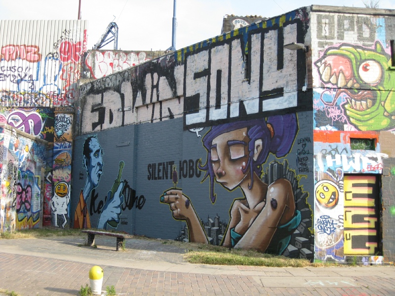 The five photographs below show the gradual obliteration of the Silent Hobo mural - and then the obliteration of part of that obliteration - on the flank wall between June and November 2017.