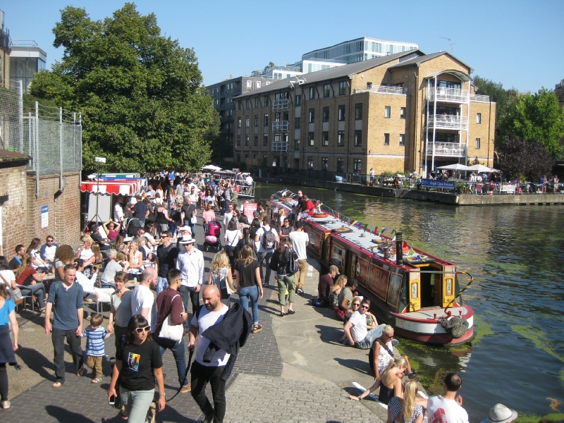 It is a long time since Wenlock Basin handled industrial traffic but a few years ago a review of a new, shared ownership housing development overlooking the basin mentioned the fact that one downside was a lack of ‘immediate green space’ and that Victoria Park is the nearest substantial open space, even though it is two and a half miles away. The most direct route is, of course, along the towpath. Other attractions to the east are the Saturday Broadway Market and, on Sunday, both the Columbia Road flower market and the Victoria Park food market. In September 2021, when visiting the Angel Canal festival, I happened to see the Duffy (6), a boat which brought its own green space wherever it moored!