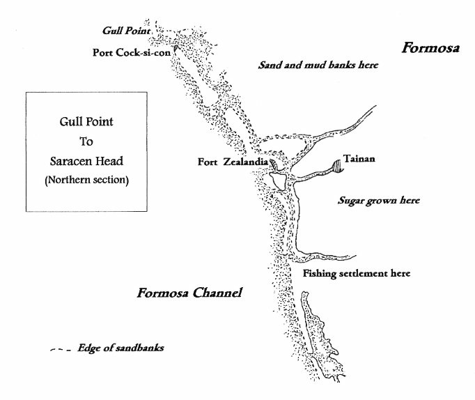 Tainan, which Richards regarded as the principle town of the whole island was situated about two miles inland from Fort Zealandia, which had been built during the Dutch occupation. This had long been abandoned but the ruins, approximately 60 feet high, served as a landmark on a coast on which there were few natural features. The commander thought that between December and March the waters close to the ruins offered a good anchorage for ships wanting to obtain supplies from Tainan, but advised that the chance of being blown onshore by southwesterlies meant it would be better to anchor further out during the rest of the year.