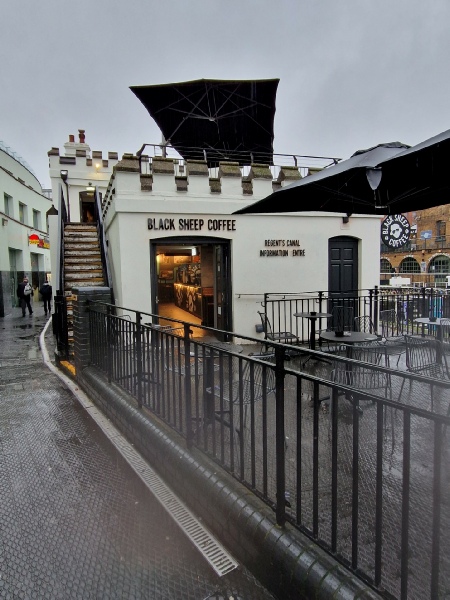 Once on the south bank you will see the old lock keepers' cottage straight ahead (3). The first cottage to stand on the site was built in 1815 and, before the project was abandoned, housed the pump for Congreve's lock. The present building is presently home to a Black Sheep Coffee Store and a series of colourful information boards, prepared by the Friends of the Regents Canal, are directly to the right once inside the main door. When the area around the Regents Canal in Camden is busy there is always a large crowd of onlookers to watch the operation of the lock gates and any entertainment that is on offer. A little after New Year 2025 I took photo 4. As you may see the performer, River Atley, suggested that tapping the card reader would buy his next coffee. Using a card reader is more and more common for street entertainers these days because fewer and fewer people carry cash, or at least loose change. However, one passerby, obviously impressed by the singing, went one better and you may see her hand presenting the singer with a coffee directly, which he seemed very happy about. Sometimes visitors add little lockable locks, signifying a romantic attachment, to the railings and judging by the number behind River Atley this must be one of the most romantic corners of the London never mind the Regents Canal!