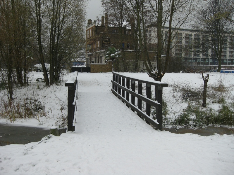 After passing under a bridge curiously named Twig Folly (which actually carries Roman Road) you will see a signpost indicating you are now in the Ecology Park (4), which contains an earth covered pavilion, a wide variety of flora and fauna and a small lake. You have the opportunity to walk through this park as you continue towards Mile End as the path, although it meanders a little bit, will bring you back to the canal towpath. As you cross a wooden bridge you will, perhaps, hear the whirring of the windmill before arriving at the palm trees which stand by the side of the Palm Tree pub (5).