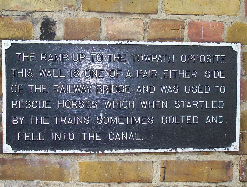 Returning to the towpath and continuing towards Chalk Farm Road (as the old Hampstead Road has now become) will take you beneath the first of the remaining brick bridges typical of those built in the 'canal age'. Although, all over the canal network, many similar bridges have been widened and strengthened, the original profile has often been retained and to the towpath user they can often look much the same as when first built. Grafton Road bridge is one of these. It was at this point a couple of years ago I thought I spotted a spring, a bubbling stream of water originating in the Bagshot Sands of the Northern Heights. But this was not a spring nor a wildlife jacuzzi either, for I later learnt it was actually run-off water from the system used to keep the underground electricity cables cool. Bang went my idea of marketing bottles of Regents Spring Water to health food shops far and wide. Another point of interest close by is the sign indicating a horse ramp (8). Steady though barge horses were they could sometimes fall into the canal, especially if frightened by the alarming noise, smoke and sparks of an early steam locomotive. The ramps were built so the horses could walk out of the canal after a tumble. I am not sure what effect smoke, sparks and steam would have on the cow I once saw perched on a nearby balcony (9).