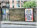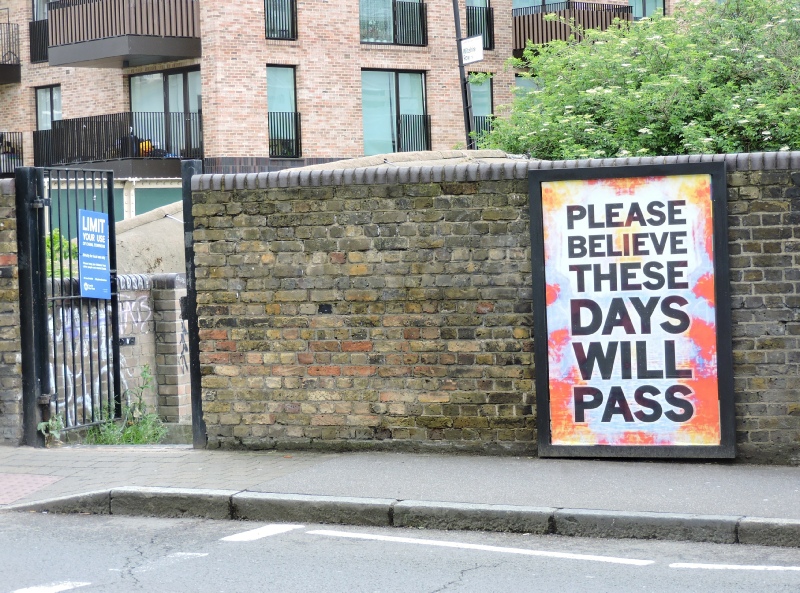 Although there is often quite a lot to see on the banks of canal and on the water itself, looking below the surface may also be rewarding and not always because of interesting aquatic plants. Returning to the towpath you will soon pass a strangely satisfying configuration of submerged stones (8) and after asking yourself ‘What this world if full of care?’ you may decide to stop and stare. Then, as you eventually walk on, you will see, as the canal curves round towards Rosemary Branch, a building with 'Rosemary Works' on its façade becoming visible over a bridge parapet. This bridge, which is beyond a pipe arching over the canal, carries Bridport Place. I would suggest leaving the towpath at this point by the adjacent steps. At the top of the steps a poster reflecting the temper of the times (9) was on display during the first pandemic lockdown. As predicted those days did pass. We can only hope they will never return.