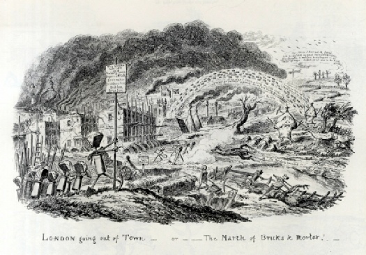 The prospectus was certainly accurate as far as the quantities of ‘Stone, Bricks, Tiles, Slates, Timber, Lime, and all the other Materials for Building and Repairs’ were concerned. As this 1829 engraving by George Cruikshank, the London born caricaturist and illustrator, shows the northward expansion of London continued relentlessly. Much of the building material would have been carried along the Regents Canal. Click to enlarge.