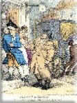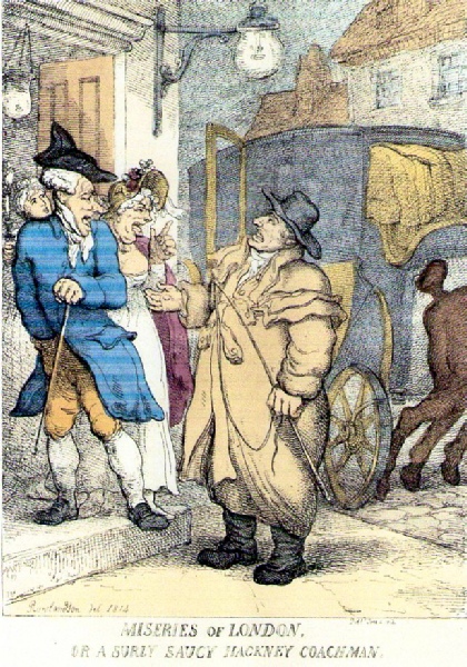 The changes which took place in England in the four decades after Napoleon was exiled to St Helena altered London much more than those in the previous hundred years. Perhaps the promoters who drew up the prospectus for the Regents Canal had some inkling of what developments might follow, but they would have been prescient indeed had they seen how soon technological development in the form of the railways would help accelerate the pace of industrial change. The houses shown in photograph 1 are on Paradise Row, right opposite Bethnal Green. They were built at the beginning of the C19th, before the final line of the Regents Canal was laid out. Prospective purchasers who lived in the City of London may well have hired a Hackney Carriage for the journey to view, carefully negotiating the price with the coachman before setting off. As the standard charges were based on distance, a timid resident, fearing a row over computation of miles and furlongs, might well have hailed a cab in Artillery Lane. The stipulated regulatory fare from there to Bethnal Green was just one shilling, so there was no room for subsequent argument with a surly, saucy Hackney coachman like the one shown in this Rowlandson cartoon (2) dating from 1814.