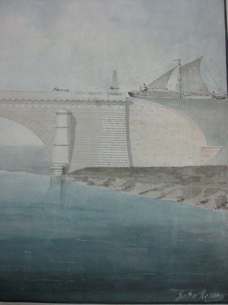 McIntosh met Rennie when working on the Lancaster. Like McIntosh, Rennie was a Scot with an agricultural background. They were fairly close in terms of age (Rennie was the eldest by seven years) and their relationship was to be important in the development of McIntosh’s career. Rennie knew just how crucial a reliable contractor was and when given responsibility for major new engineering works in London, it is not surprising McIntosh followed him to the capital. Near the town of Lancaster itself the grand Lune Aqueduct, a tribute to Rennie’s work on the Lancaster Canal, may still be seen. Before it was built the architect put pen and brush to work to show how it might be in operation although we might wonder if a strong gust of wind (plenty of those in north Lancashire) might carry the boat and crew past the horse! Fanciful projection or not the aqueduct was built according to Rennie’s design, a modern visitor being able to ‘rest awile’ on a commemorative stone seat as they reflect on the build quality.
