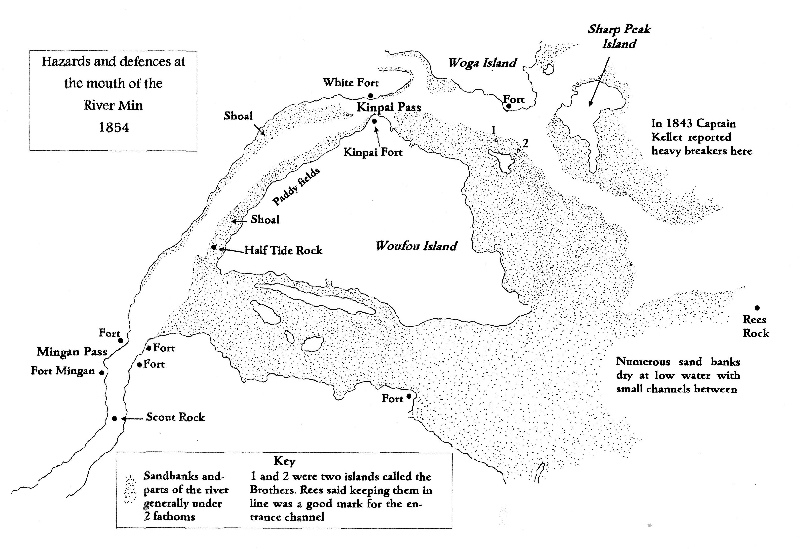 The chart of the mouth of the Min drafted by Thomas Rees, commander of the Lord Amherst, was fairly simple, reflecting the results of a restricted number of soundings and observations, but some rocks and sandbanks were identified and a suggestion made as to the best access channel. His work was followed by that of two Royal Navy captains, Kellet and Collinson in the 1840s but it was Richards who was to make the most comprehensive surveys.