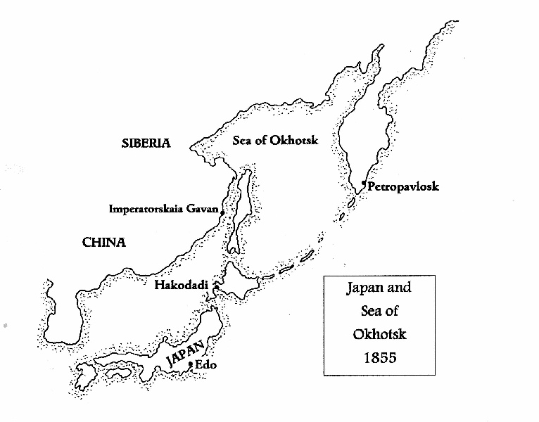 By the 1840s the Manchu empire was clearly much weaker than it had been a century and a half previously and, aware of how Britain had made territorial gains in Burma and China, some elements within the Russian government thought the time had come to try to open the river route to the Gulf of Tartary and Sea of Okhotsk. Clearly, Russia did not want to be left behind in any scramble for the north-west Pacific. They had a champion in Nikolai Muravev, the Governor-General of eastern Siberia, who was suspicious of the British and thought they might try to seize the mouth of the Amur themselves. In 1853 Czar Nicholas I authorised Muravev to launch an expedition and in May of the following year over seventy rafts and barges began to transport an impressive military force down the river. By that time Britain and Russia were at war but as the Chinese government, struggling against the Taiping rebels, offered no resistance the Russians were able to establish themselves at De Castries Bay on the Gulf of Tartary without opposition. This remote bay had been named by de La Pérouse, who had explored the area seventy years earlier. Another bay, about 150 miles further south, was also used as a base but this had no French overtones. It was called Imperatorskaia Gavan, or Emperor’s Bay and the emperor after whom it was named was certainly not Napoleon III. It was at Imperatorskaia Gavan that Muravev met Putiatin, someone whom Stirling had been trying to locate for some time and who, by April 1855, had a significant naval force at his disposal.