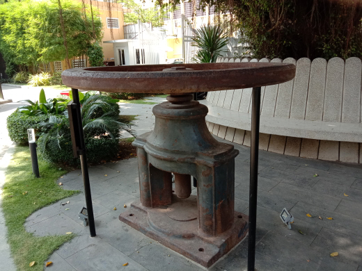 In the grounds of the Sosoro museum in Phnom Penh there is a coin screw press of indeterminate age. A plaque indicates it was found in 1960 near Udong and that local villagers believed it was the residence of a neak, or spirit. Parts are broken and words on the surface, which might give a clue to where it was manufactured, are illegible. However, it is known that a screw press was imported from Birmingham in the early 1850s and assembled at Oudong, so perhaps the machine on display was one of several bought by King Ang Duong who intended to have his own mechanical mint. The British screw press arrived via Singapore.