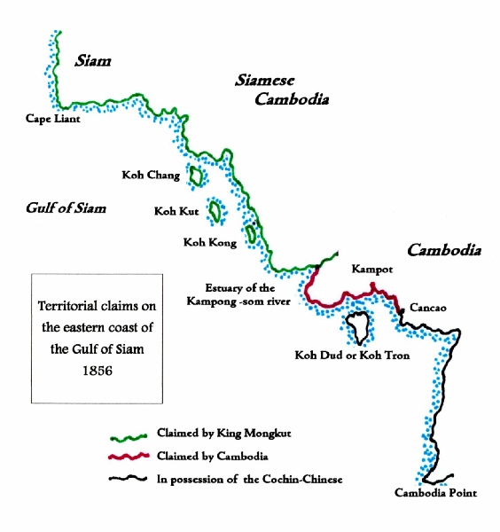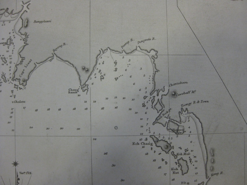 On the 1860 edition of the Cape Liant to Koh Kut chart the hinterland is shown as Camboja yet the area was certainly regarded by the Siamese government as being part of Siam. However, those parts of the Siam that had been acquired from Cambodia in the late C18th (and which included the Angkor complex) were known as Siamese Cambodia and the population remained overwhelmingly Khmer, which was, and is, the predominant ethnic group in Cambodia itself. It would have been difficult for Richards to have ascertained where the border actually was because it was not until some years later that map makers began to engage in inland survey work using scientific methods. Subsequently, maps defining borders, so important in colonial expansion, were produced but before that, generally speaking, a border might be a hazy concept linked to the ethnicity of those who lived in villages, or a bank of a river or a range of hills. King Mongkut might well have accepted Cambodja as referring to Siamese Cambodia, but nonetheless, according to the first of Richards’ notes, the monarch claimed dominion as far as the Kampong–som estuary, which was a long way from Koh Kut. Richards gave no opinion as to whether this claim was valid or not but his second note stated that Cambodja includes the coast between Kam-pong-son and Cancao, a town which was further south-east than Kampot. The third note indicated The Cochin Chinese are in possession of Koh Tron, Cancao and the entire coast to the southward.(underlined words show Richards emphasis).